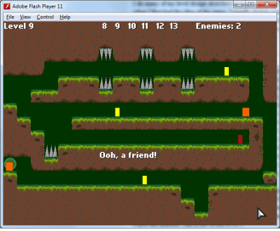 Level design is something I thought was easy, but I find it actually isn’t, especially when I have run out of ideas or the level does not make sense. I do many of my level design sketches on paper. Quite a few of my main initial levels were brainstormed when I first had the idea of the game. I usually sketch some level ideas when I’m bored and without the computer and sometimes on the bus. When I run out of ideas, I just randomly edit the level in the code and see what I can come up with. This is how level 9 is represented in the code.
