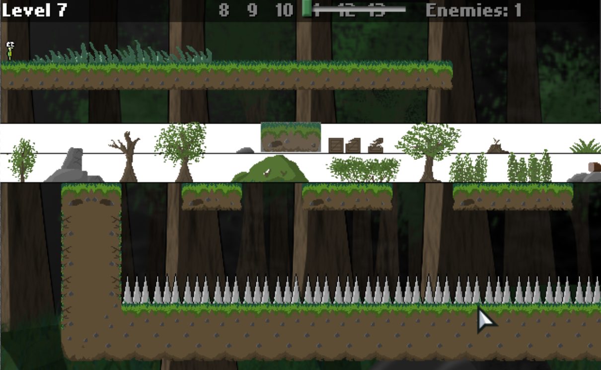 The latest new feature is the ability to throw rocks. Toward the end of the day, I decided to work on this feature. Rocks can now get rid of enemies, and destroy spikes. I also fixed a bug where the rocks were invisible (so basically enemies and spikes were disappearing for no reason before that). They can also destroy tiles! Bugs arose of course – with the wrong tiles being deleted, but I have managed to fix all the bugs in the feature surprisingly quickly.