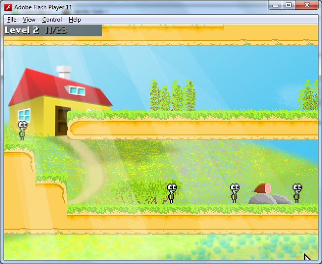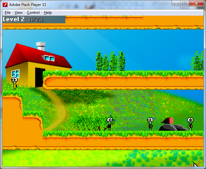 The background layer which consists of the background. Flixel, the engine used, has something called scrollFactor which I found to be very incredible. I set the background’s scrollFactor to 0.5 so the background moves with the character, but at a slower rate. Previously, the background was just stuck there as a static, immovable picture. Now it has a cool scrolling effect that makes the game look like it has depth.