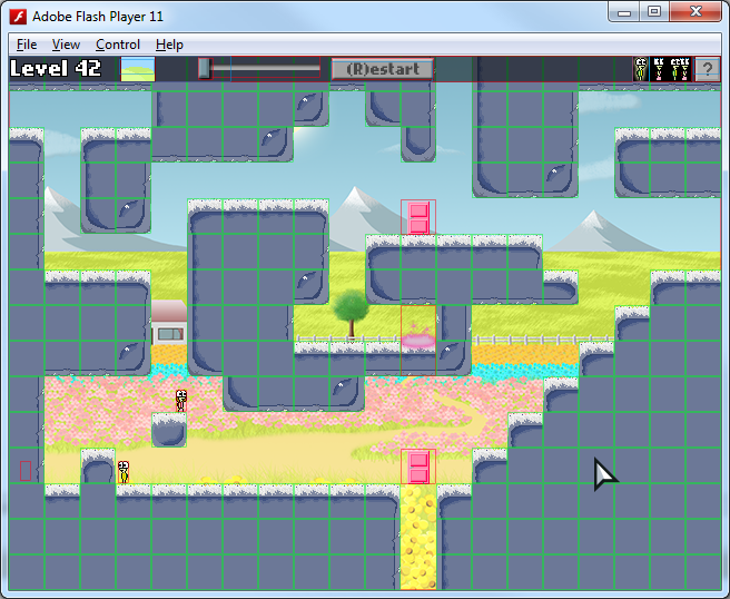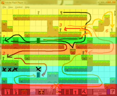 Today I added what seem to be the two most tedious levels to code. In Levels 41 and 42, the girl player is able to move by herself! The colourful picture below shows me mapping the zones through which the player will traverse through, and based on which zone the girl is in, direct the girl in a specific direction.