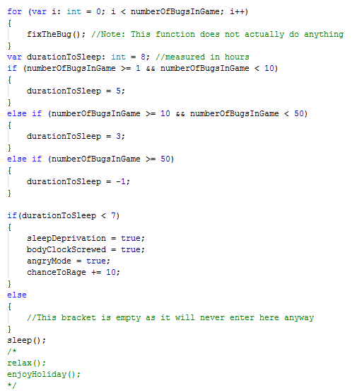 I wanted to put this picture above as I was writing about programming, but I decided to leave this till the end anyway. Here’s a piece of code I wrote for fun. It’s called “HowMyBrainWorks.as”