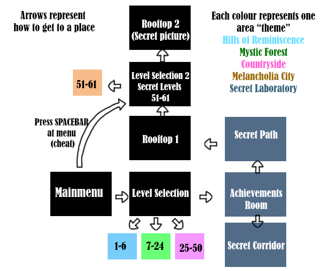 I created a map of the game a long time ago to give an idea of how the game states are structured. I think I will have to make a new map soon since the game has expanded to house several more places and levels, such as the Hidden Memories.