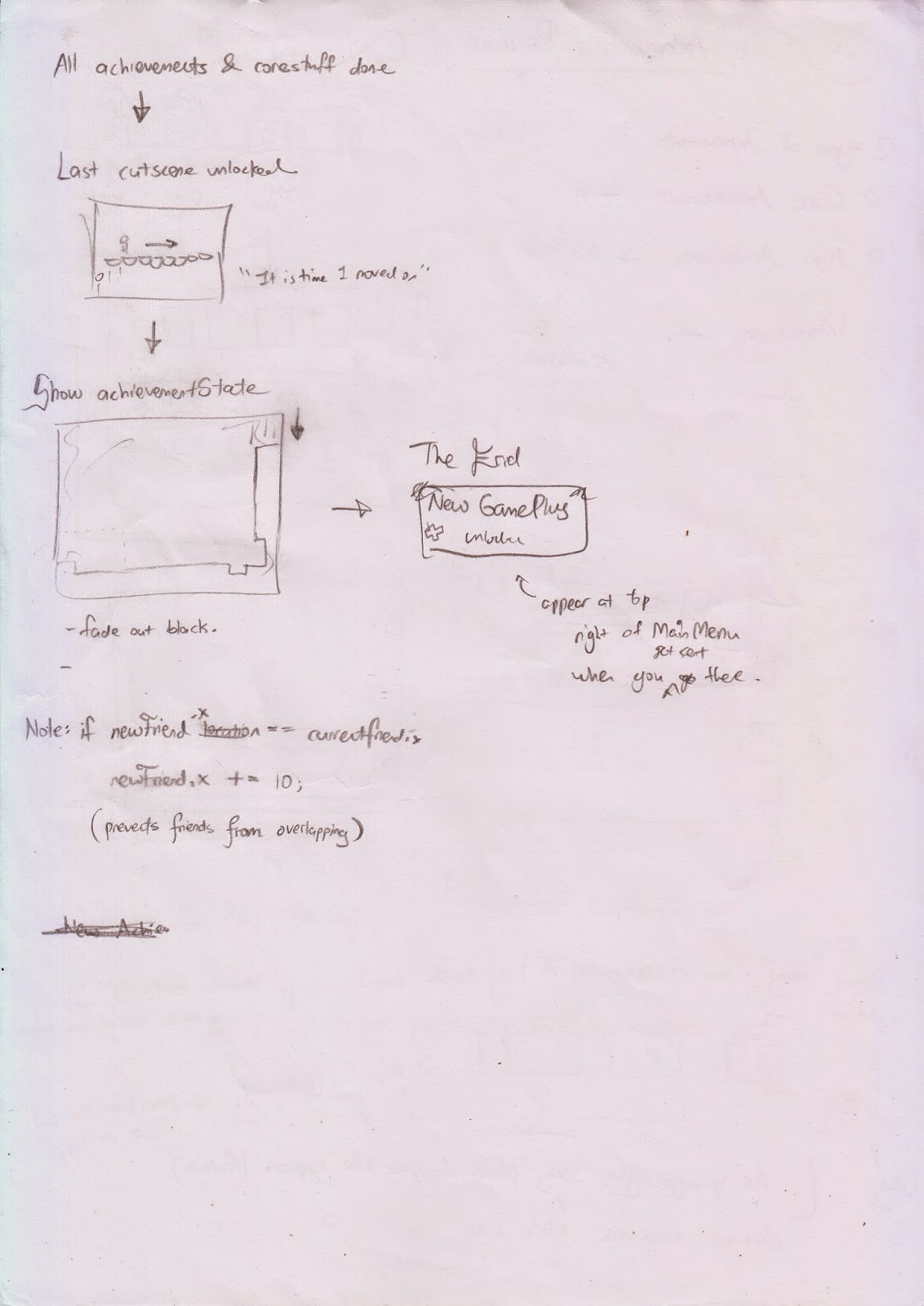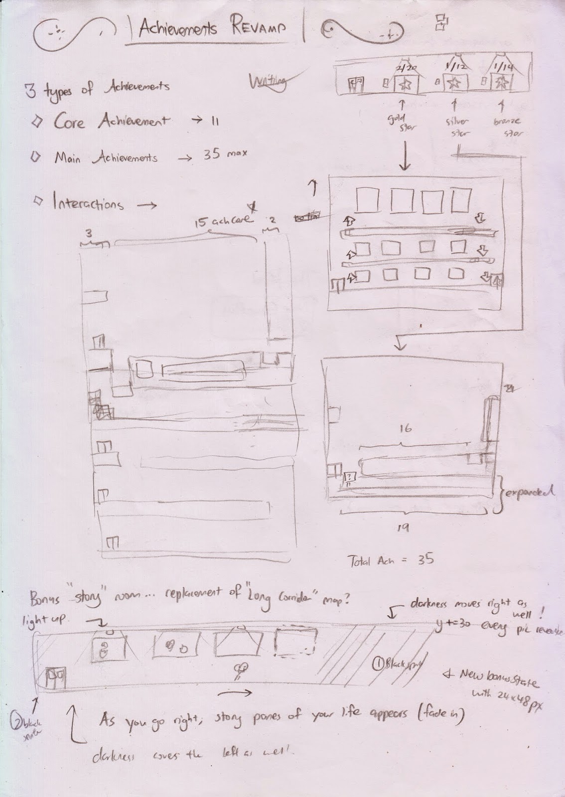 Also, there was one week which I couldn’t go home, and knowing I wouldn’t have access to my computer for an entire week, I brought with me a pencil, and lots and LOTS of paper, just to make sure that on the week which I couldn’t go back home, at least I would be making heavy progress. One of the things I wanted to work on in my to-do list was an achievements revamp. The current achievement system in the game is growing more and more outdated as I add new features, levels, special cutscenes and other mechanics to the game