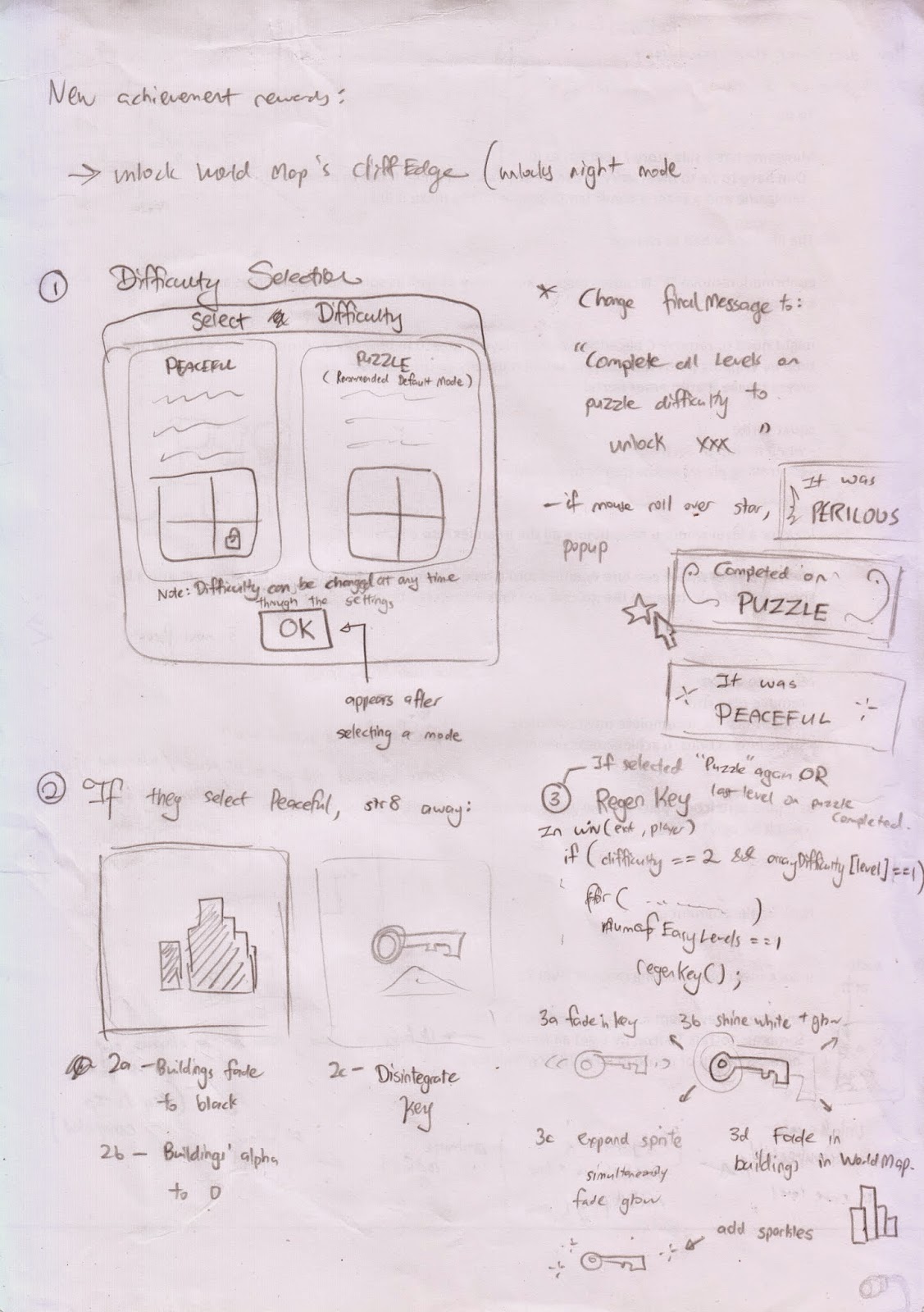 On the left, I made a sketch of what I envisioned to be the new Difficulty Selection popup, along with lots of extra stuff, such as displaying above each level on what difficulty you completed the level on.