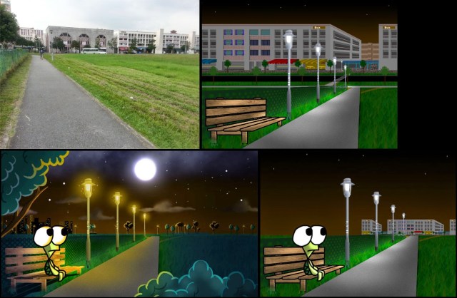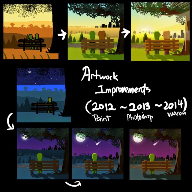 Here you can see one of the pictures I took and how it inspired me to actually draw a cutscene for the game. The one on the top right was drawn 1 year ago! And with my new tools and skills I acquired drawing over the past year, I made a new cutscene (bottom left), while at the same time expanding the cutscene horizontally for increased parallax scrolling distance.