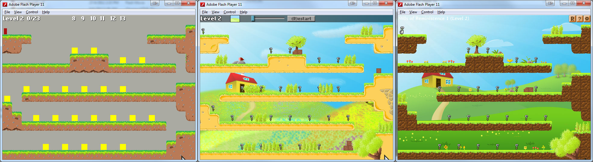 I started learning ActionScript, a totally new language, in a totally new world of Flash, using a totally new engine called Flixel, with a totally new IDE (FlashDevelop). Ultimately, I think it was my passion that fueled me, because within three weeks, I had my game prototype. I had a controllable player (yellow square) that could walk and jump, enemies that had some basic AI. I even coded some puzzle elements like keys that could open passages, doors that could teleport you and buttons that activate elevators. There were levels, a level selection, a menu. I was excited. I had actually created a game! My first game!