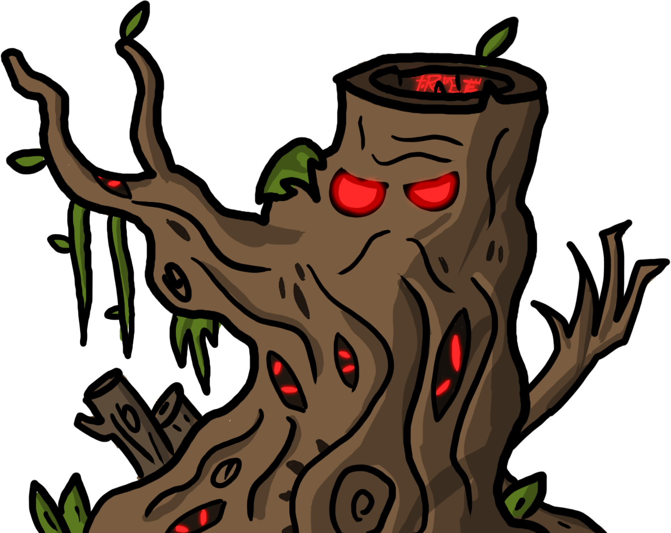 This started out as a simple bush monster until I realised I needed an area boss, so it evolved when I added a “shell” for it to sit in, and rocks below it. I drew branches growing out of it to make it more detailed, but apart from its huge size, it wasn’t very boss-like. To make it look more menacing, I added spikes and a skull, as well as patterns around its eyes to differentiate it from a normal un-intimidating bush monster, like the one below: