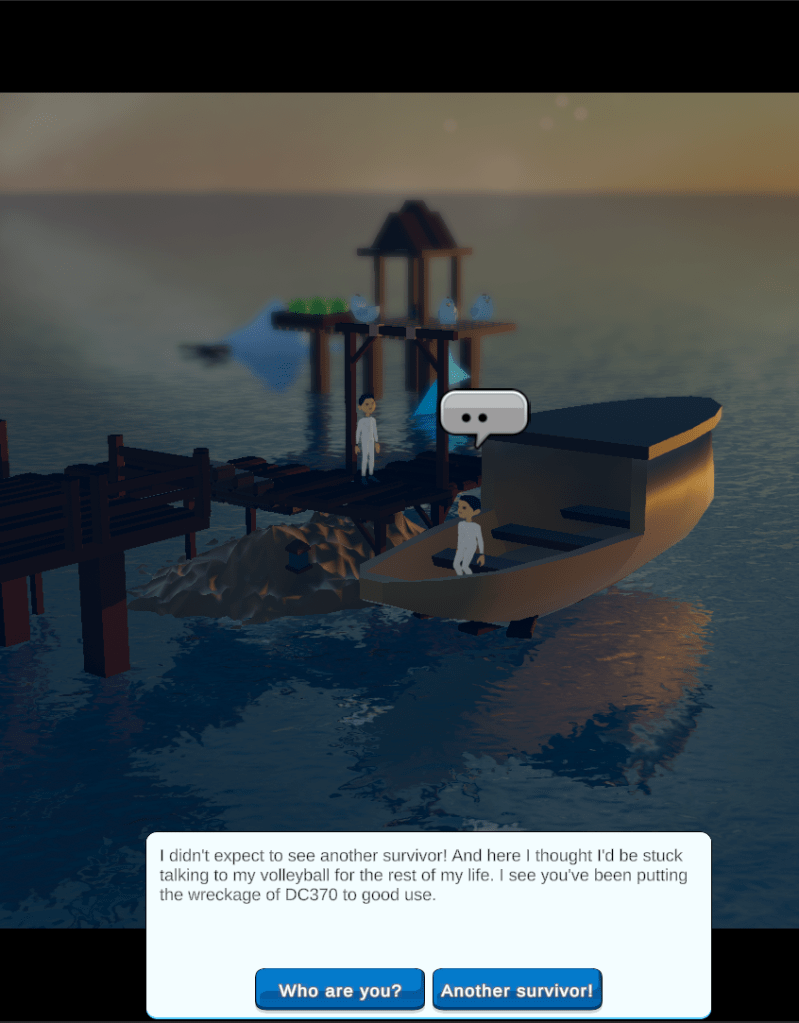I believe this is an improvement to storytelling from my previous games. All cutscenes should ideally be a result of player’s actions, and will trigger an event to happen. It should also be clear what is going on. In the above case, a boat with a survivor appears.