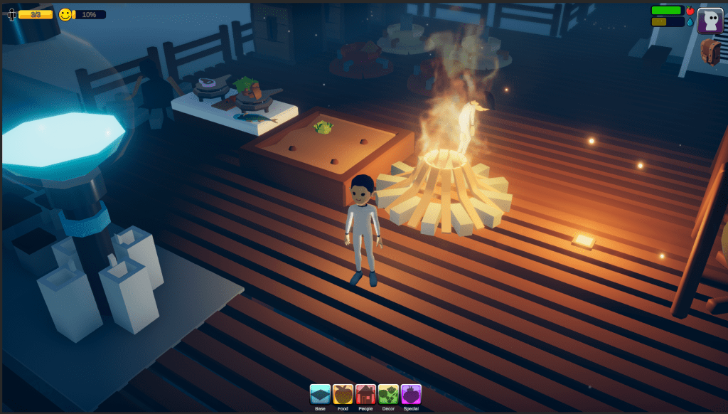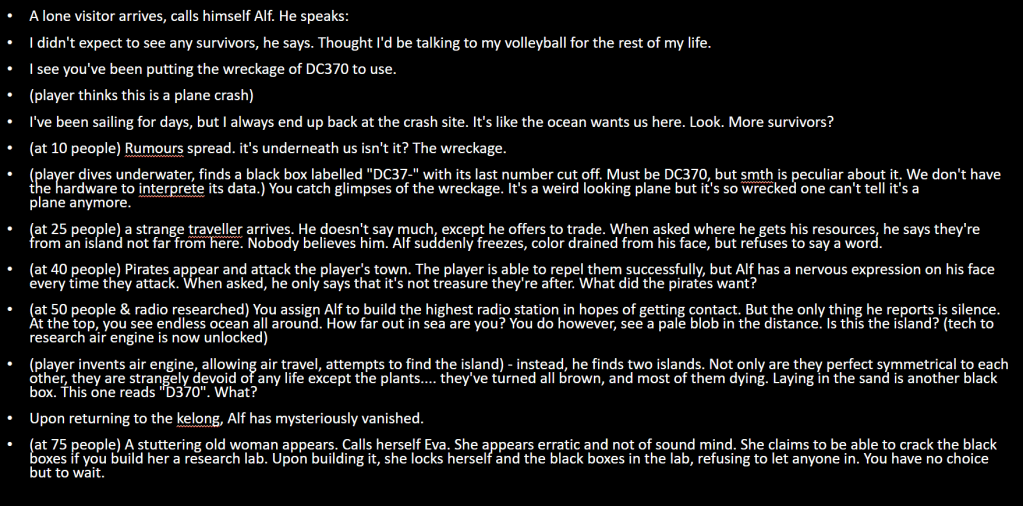 I think it is an important moment when the player meets their first outsider. I name him Alf, and he will be the person to kickstart the story and be the Call to Adventure. The story will slowly unravel as he meets and ‘recruits’ more people to come aboard the settlement.