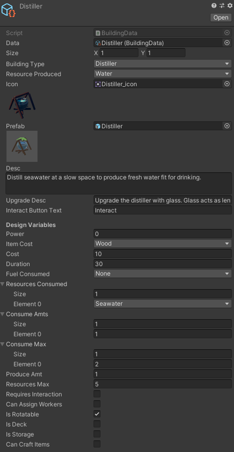 Aside from that, I need to create for myself a way to store building properties. I created ScriptableObjects which store data for each building, and these values are all easily adjustable in one place.